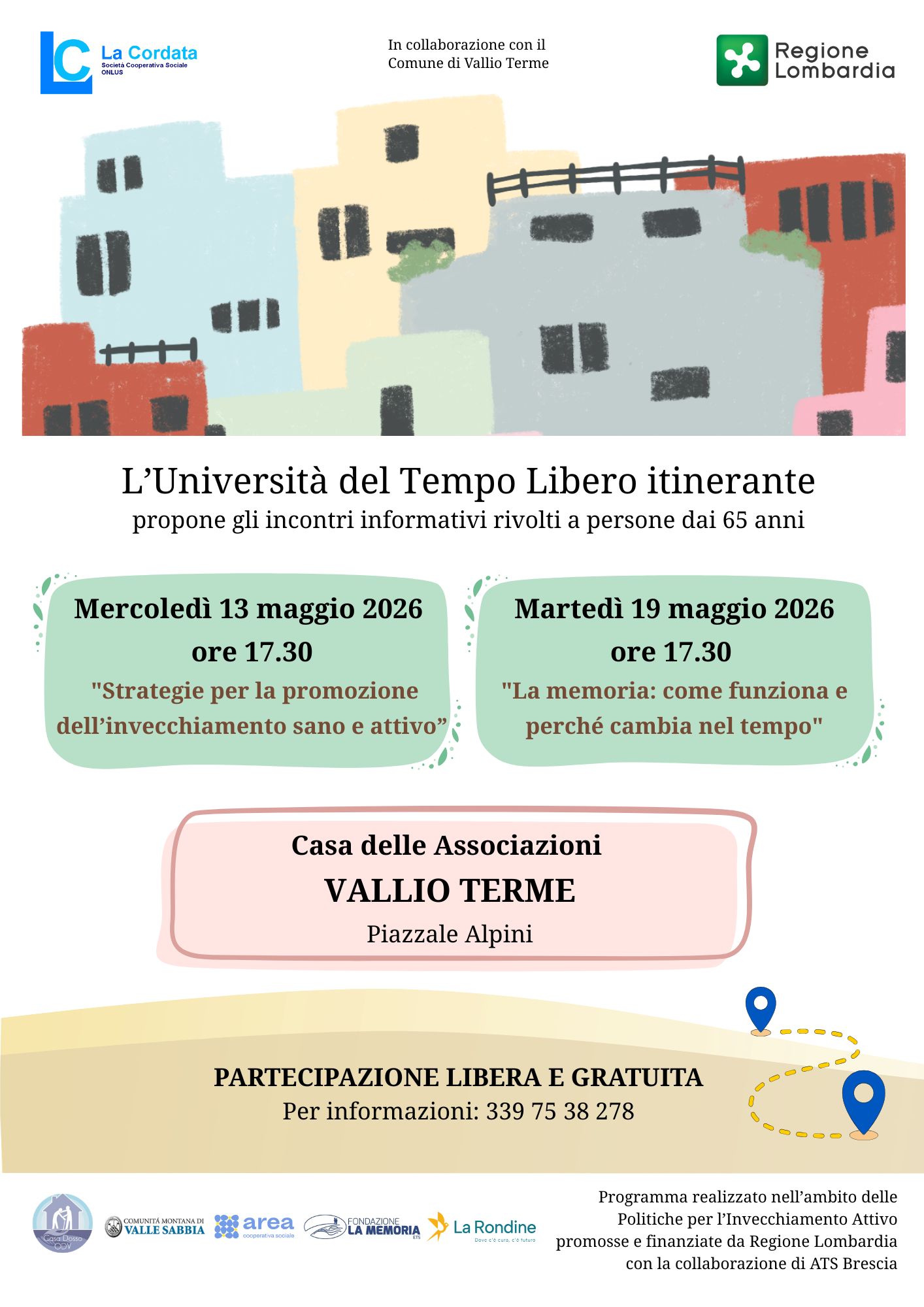 Il Comune di Vallio Terme, nell'ambito delle Politiche per l'invecchiamento Attivo promosse da Regione Lombardia, invita la cittadinanza a partecipare a "Gli Approfondimenti della Memoria". Il progetto è proposto dall'Università del Tempo Libero itinerante ed...